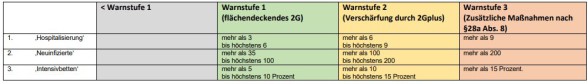 In Warnstufe 3 gelten mindestens die Regelungen der Warnstufe 2 fort. Zum Teil werden auch darüberhinausgehende Verschärfungen benannt. Diese sind aber noch nicht abschließend, sondern werden im Lichte des neuen § 28a Abs. 8 IfSG noch geregelt. Eine gesonderte Information folgt.
